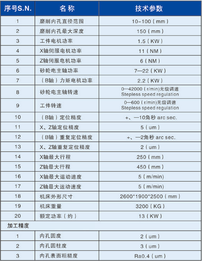 ●本機床為三軸(X進給、Z砂輪、B分度軸)數控內圓磨床,主要用于磨削工件的內圓孔、內錐孔、內端面、外端面的磨削。磨削循環均自動完成(具有自動進刀、退刀、粗磨、精磨;自動修正砂輪、自動補償等功能)。●機床采用工件進給,B軸分度(力矩轉臺),工作臺(砂輪架)左右運動的結構方式,工件箱進給及砂輪架運動導軌均為滾動直線導軌,均由伺服電機驅動滾珠絲杠運動,工件主軸及砂輪主軸旋轉速度均由變頻器控制,實現無級調速。工件夾緊為液壓動力卡盤,同時可以根據用戶工件的特殊性配置其它相匹配的夾具