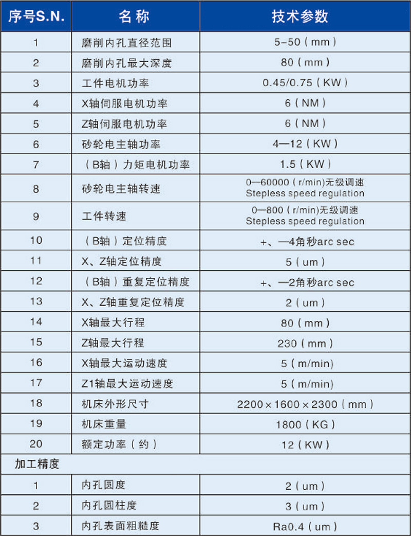 ●本機(jī)床為三軸(X進(jìn)給、Z砂輪、B分度軸)數(shù)控內(nèi)圓磨床,主要用于磨削工件的內(nèi)圓孔、內(nèi)錐孔、內(nèi)端面、外端面的磨削。磨削循環(huán)均自動完成(具有自動進(jìn)刀、退刀、粗磨、精磨;自動修正砂輪、自動補(bǔ)償?shù)裙δ埽?br /> ●機(jī)床采用工件進(jìn)給,B軸分度(力矩轉(zhuǎn)臺),工作臺(砂輪架)左右運(yùn)動的結(jié)構(gòu)方式,工件箱進(jìn)給及砂輪架運(yùn)動導(dǎo)軌均為滾動直線導(dǎo)軌,均由伺服電機(jī)驅(qū)動滾珠絲杠運(yùn)動,工件主軸及砂輪主軸旋轉(zhuǎn)速度均由變頻器控制,實(shí)現(xiàn)無級調(diào)速。工件夾緊為液壓動力卡盤,同時可以根據(jù)用戶工件的特殊性配置其它相匹配的夾具●機(jī)床為全封閉防護(hù)罩殼,前置回轉(zhuǎn)式操作箱、后置背包式電器柜。