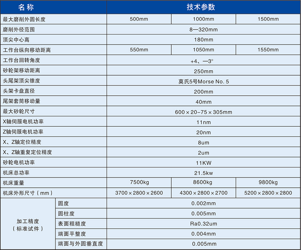 ● 本機床為二軸(砂輪架橫向斜進給X軸、工作臺縱向運動Z軸)二聯動斜進式端面數控外圓磨床,數控系統采用國際或國內知名品牌。具有自動進刀、退刀、粗磨、精磨,修正砂輪,自動補償等功能,加配自動測量儀,能實現外圓、端面的磨削循環的全閉環功能。● 砂輪主軸采用套筒式或動靜壓主軸,砂輪架導軌采用鋼導軌,工作臺導軌采用平一V型貼塑潤滑導軌,采用伺服電機滾珠絲杠驅動進給機構及工作臺移動。