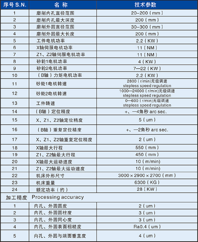 ● 本機(jī)床為四軸(X工件橫向進(jìn)給、Z1、Z2砂輪縱向運(yùn)動(dòng)、B水平方向分度)多功能數(shù)控磨床,主要用于磨削工件的內(nèi)圓孔、內(nèi)錐孔、內(nèi)端面、外圓、外錐面、外端面、內(nèi)、外球形等復(fù)雜要求的磨削。磨削循環(huán)均自動(dòng)完成(具有自動(dòng)進(jìn)刀、退刀、粗磨、精磨;自動(dòng)修正砂輪、自動(dòng)補(bǔ)償?shù)裙δ?。