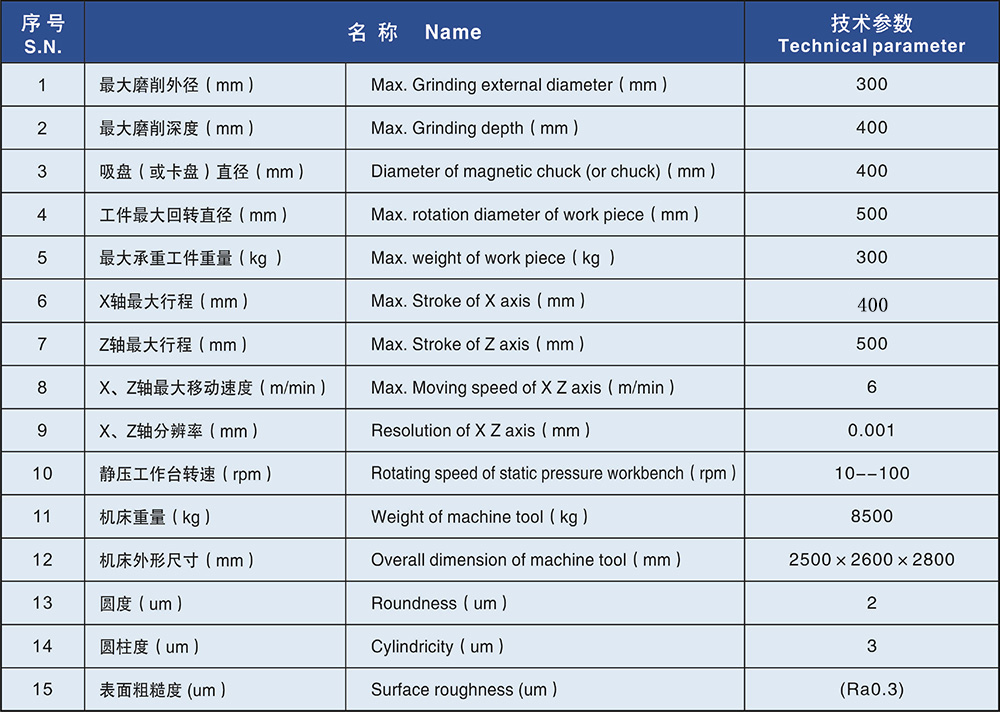 1、本機(jī)床為二軸二聯(lián)動(dòng)數(shù)控立式外圓磨床,能對(duì)零件的外圓、外臺(tái)階面、外端面等多表面的磨削。